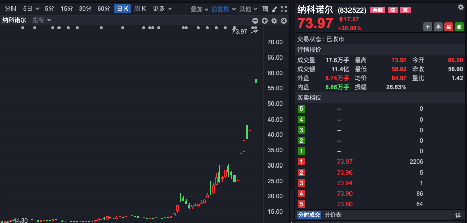 纳科诺尔30%涨停,3日2度封板,股价创历史新高;科恒股份、信德新材、唯赛勃等多股20%涨停,有研新材、传艺科技等批量涨停。