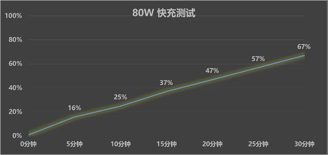80W快充30分钟充至67%,5分钟补电16%,救急情状下也能快速回血。